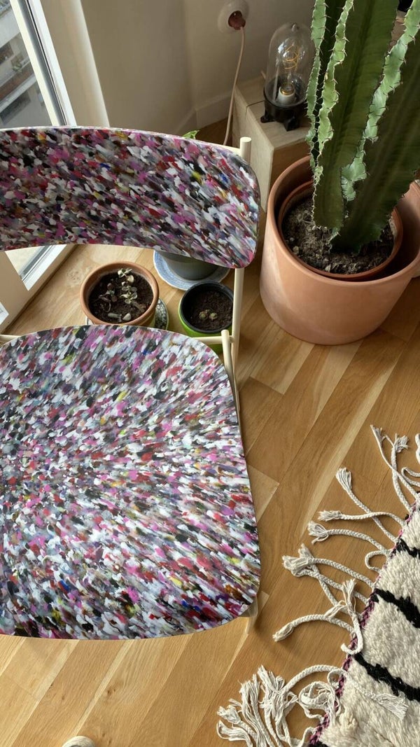 Ce sont deux coques de plastique recyclé sur une structure en fil d’acier recyclé.